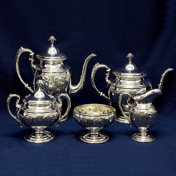 Sale Price: $3,950 (Regular Price: $5,950)This exquisite 5-piece sterling silver tea and coffee set, patented in 1942 by Towle Silversmiths, is a true collector's item. With a total weight of 79.29 troy ounces of .925 sterling silver, this set includes a teapot, coffee pot, creamer, sugar bowl with lid, and waste bowl.