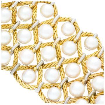 Buccellati Italy cultured pearls necklace on 18k yellow & white gold woven textured lattice motif. Cultured pearls are 5.00 to 6.00 mm, with silvery body color with slight pink and green overtones with very good luster. Bucellati scratched number on the tongue of the clasp: 26973. Necklace is signed Buccellati 18k Italy. Width: 30mm- Length under 15 inches.
