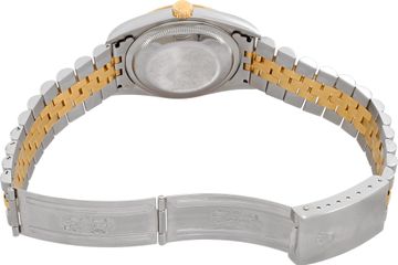 Certified Pre-owned Classic Rolex Datejust 16233 watch is made out of Stainless steel on a 18k & Stainless Steel bracelet with a Stainless Steel Deployant buckle. This Rolex watch has a 36 x 36 mm case with a Round case back and Champagne Diamond Custom dial. It is Gray and Sons Certified Pre-Owned and comes backed by our 24-month warranty. Each watch is inspected by our in-house watchmakers before shipment including final servicing, cleaning, and polishing, if needed.