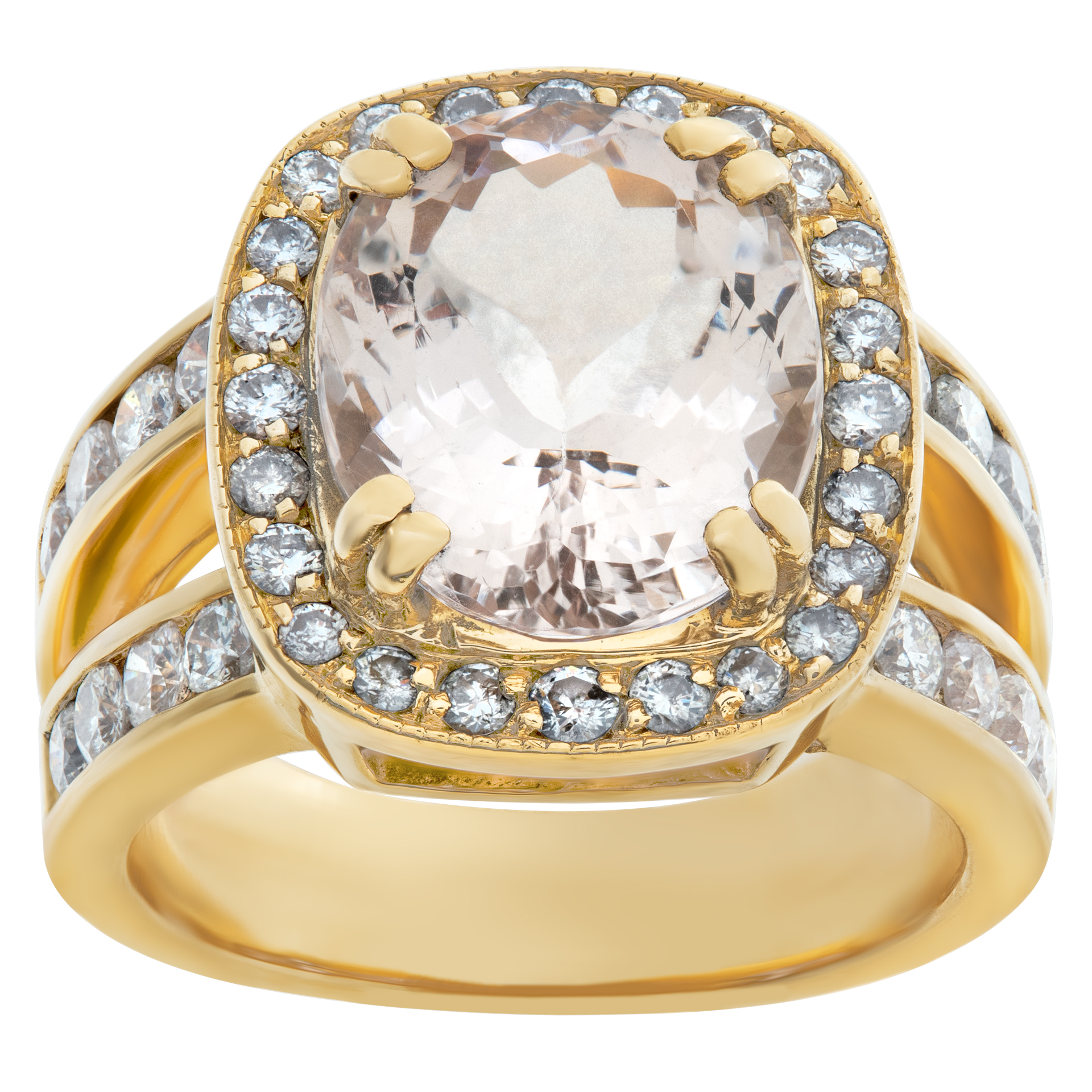 This stunning ring features a brilliant cushion-cut morganite stone surrounded by over 1.07 carats of diamonds, all set in 18k yellow gold. A true masterpiece of jewelry craftsmanship.